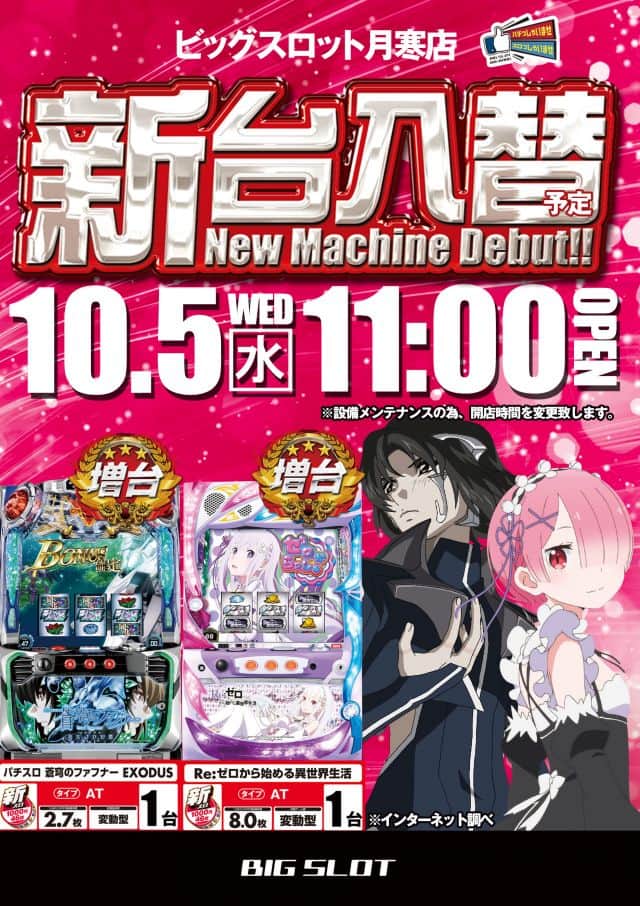 ビッグスロット月寒店です! 10月10日(月) ☆全店一斉 ひる11時開店☆ ※設備メンテナンスの為開店時間を変更いたします。 皆様のご来店をお待ちしております。