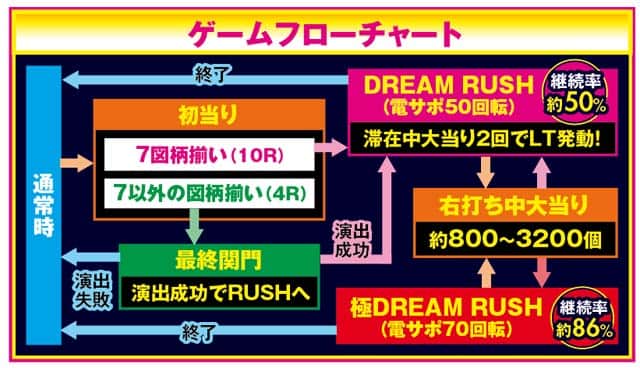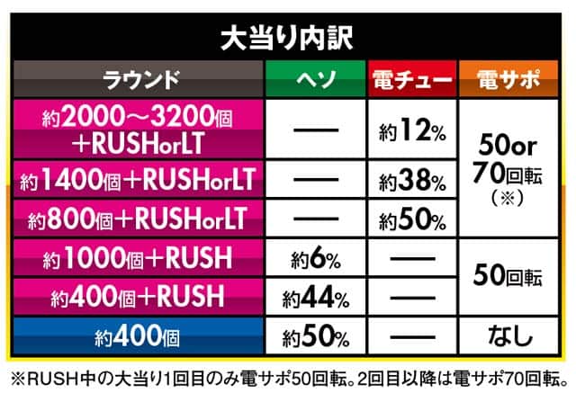 ※1 図柄揃い確率(普図ロング開放時。特図2実質確率1/1を経て大当り)。特図2に限る。※2 RUSH中の大当り1回目のみ電サポ50回転。2回目以降は電サポ70回転。
