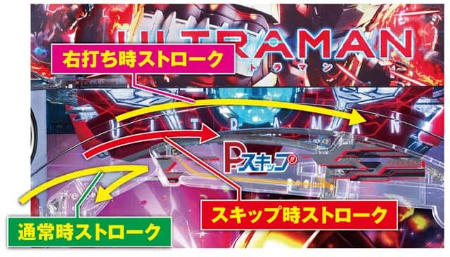 2025年4月に登場した『eシン・ウルトラマン』に搭載されていた「P-スキップ」を採用。スキップの仕方は簡単で、通常時のデジタル回転中に若干強めのストロークで天の部分に玉を1発通せば「P-スキップ」が発動! 直後に当落結果が告知され、ハズレの場合は次の回転が始まる(大当りの場合は待機時間が発生)。ハズレ変動を飛ばすことで時間効率を大幅にアップさせることが可能で、もしもよくデジタルが回る台なら時間500回転も夢じゃない。