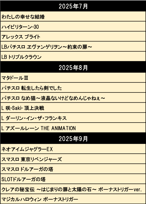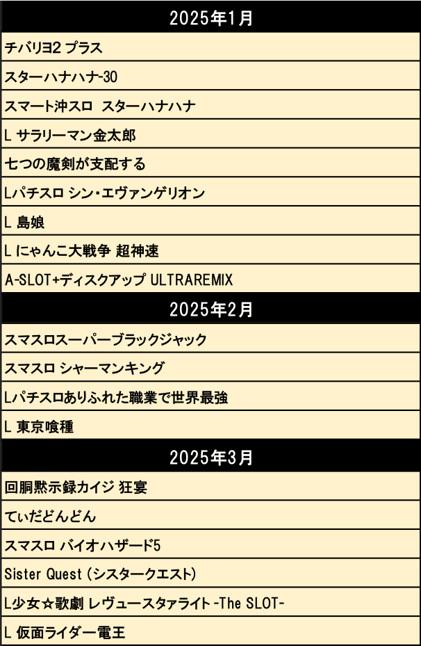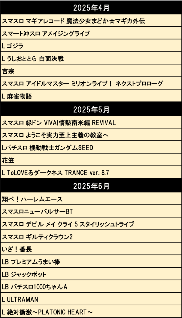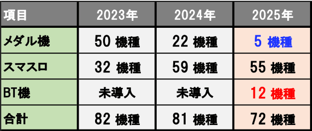 そしてもう一つの大きな特徴は、メダル機の大幅減少です。全5機種と掲載していますが、その内2機種はバージョン違い(スマスロ、メダルの両方で登場)であるため、実質3機種ということになります。まさかここまで登場していなかったとは…。