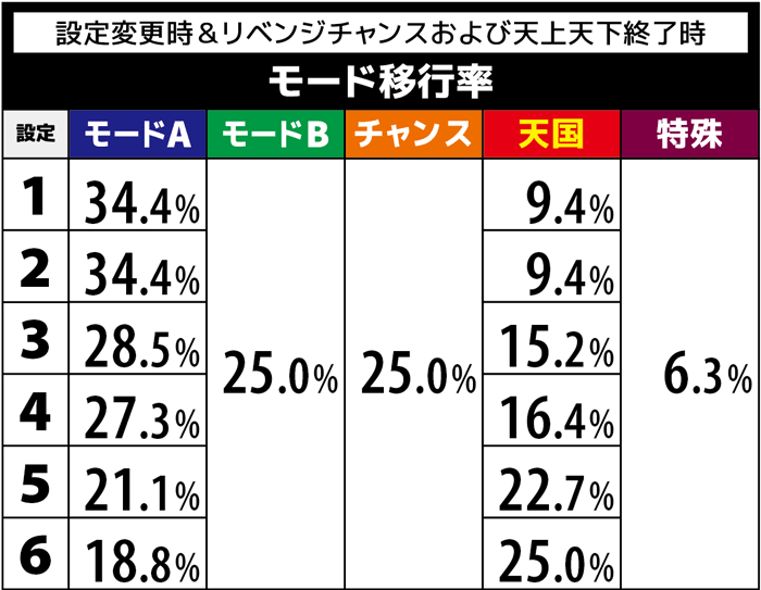 設定変更時/リベンジチャンス終了時/天上天下唯我独尊終了時のモード移行率は上記の通りで、低設定域でも約65%でモードB以上からスタート。