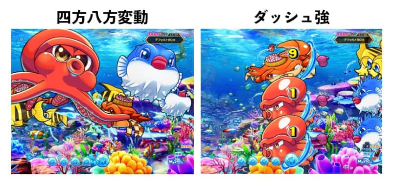 変動開始時の図柄アクションが一新。四方八方に図柄が変動したり、ダッシュ強パターン発生で好機。