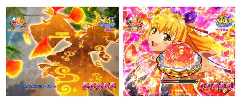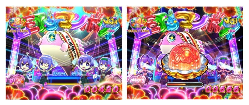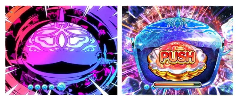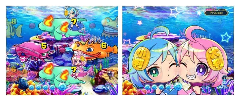 エフェクトが連続するほど好機となり3連続で大チャンス。マリンちゃん登場時にボタン押下成功で確変昇格濃厚⁉