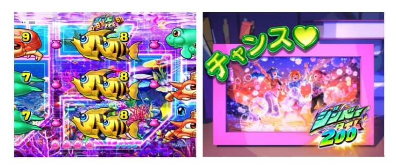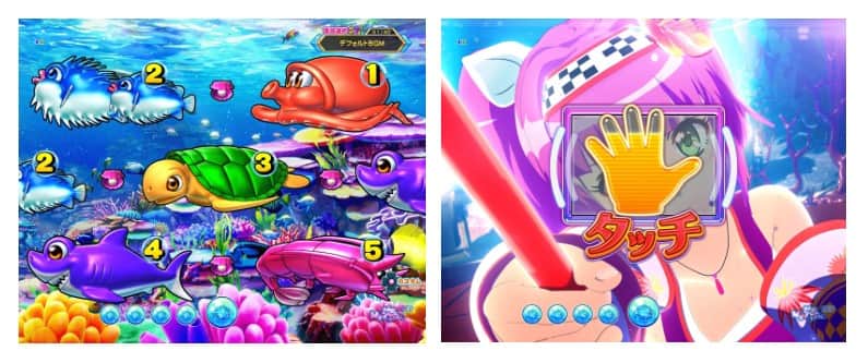 リーチ後にキャラが集合すればチャンス。液晶タッチ演出で魚群が出現すれば大チャンス。着ている衣装によっても期待度は変化。