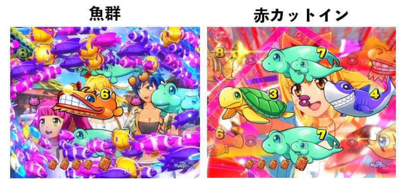 SPリーチ中は魚群or赤カットインが出現すれば信頼度大幅アップ。複合すればさらにアツい。
