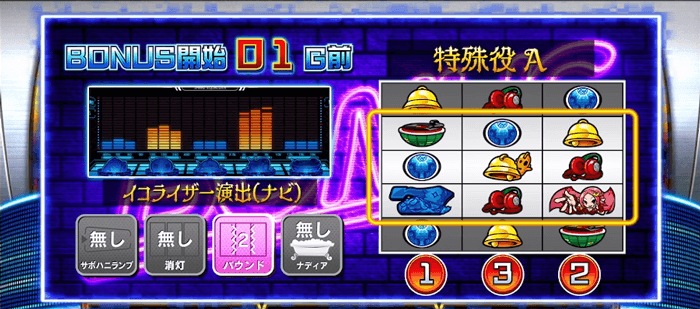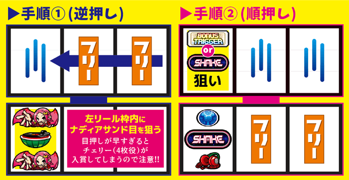 青7頭のボーナスが否定された後はチェリーをフォローしつつ、以下の手順でナディアBBを狙おう。