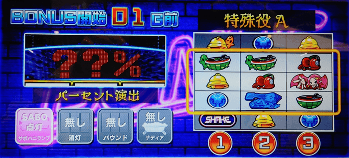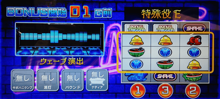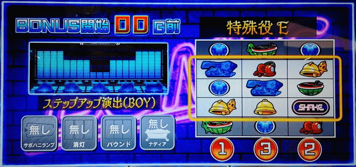 本機『SHAKE BONUS TRIGGER(シェイク ボーナストリガー)』に搭載されたBTはループ性が付与されたタイプで、初当りBB後に必ず発動。