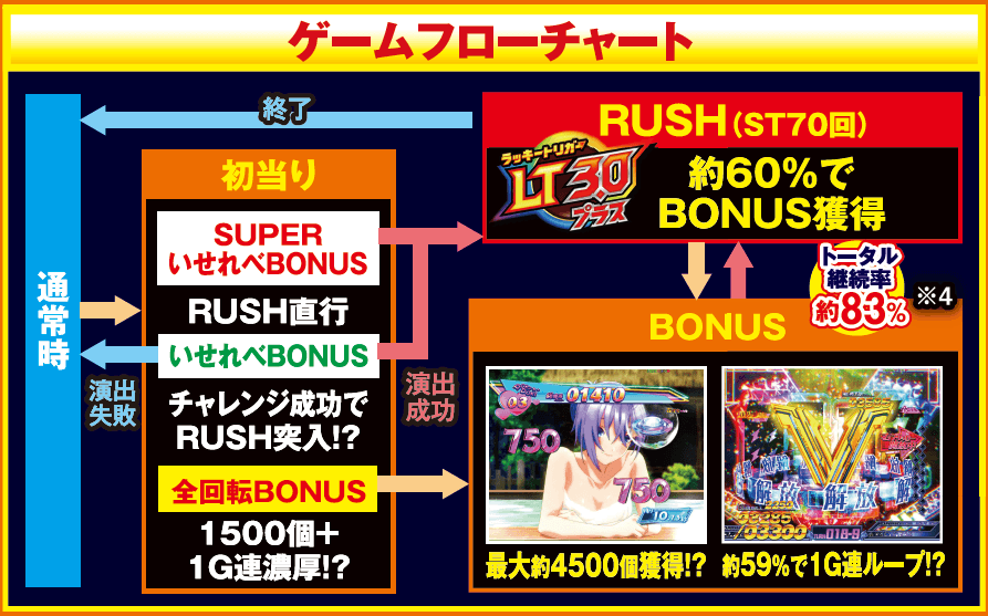 RUSH×BONUS 1G連トータル継続率 | 約83%(※4) |