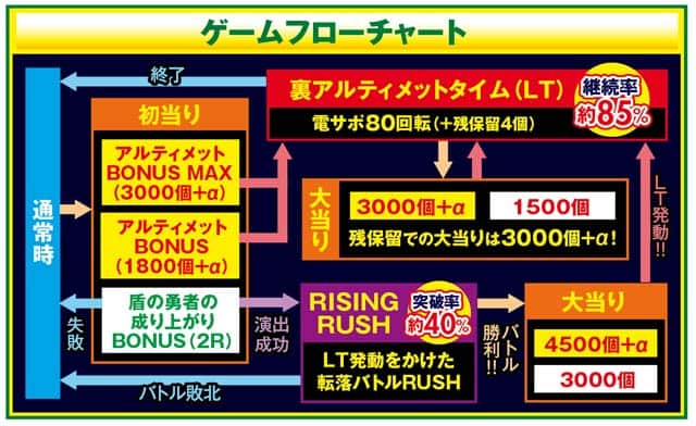 ※1 転落小当り当選で終了(勝率約40%)。 ※2 継続率は残保留込み(残保留引き戻し時は3000個+α)。 ※3 電サポ終了後は残保留4個アリ。