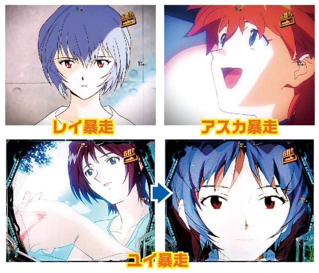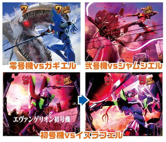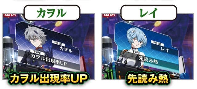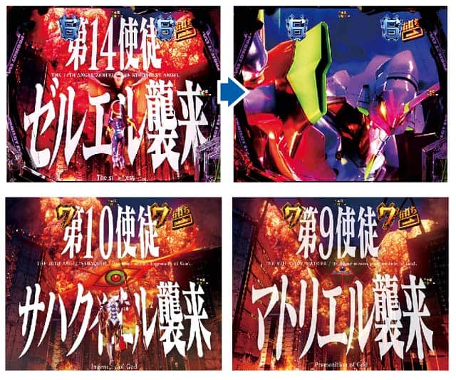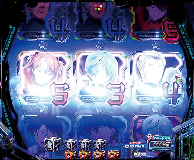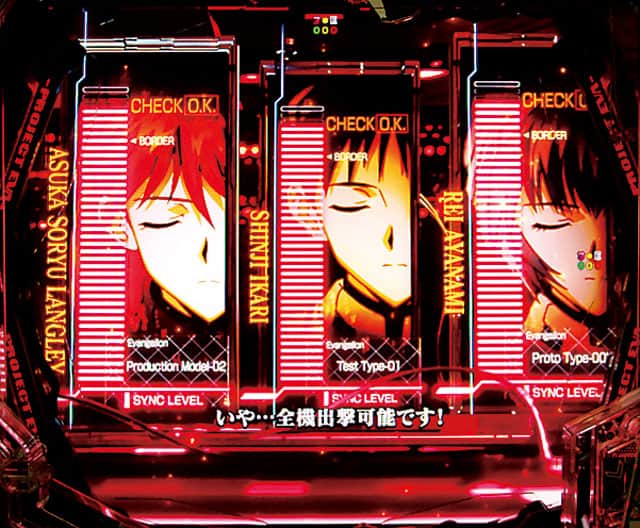 出撃するエヴァは零号機<弐号機<初号機の順に期待できる。リーチ冒頭や使徒登場時の文字が赤いとチャンスアップパターンだ。