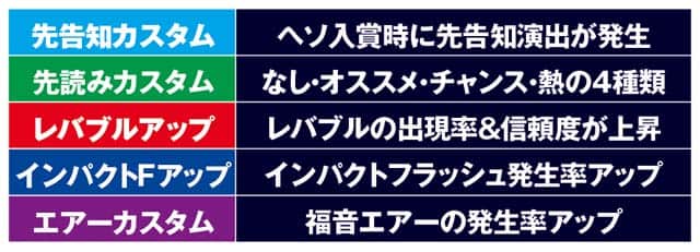 新たに先告知カスタムを追加。入賞時に発生する演出は、アラート<咆哮<次回予告<カヲルレイ背景の4種類から選択可能だ。その他にも先読みやレバブルアップなどおなじみのカスタムを搭載している。