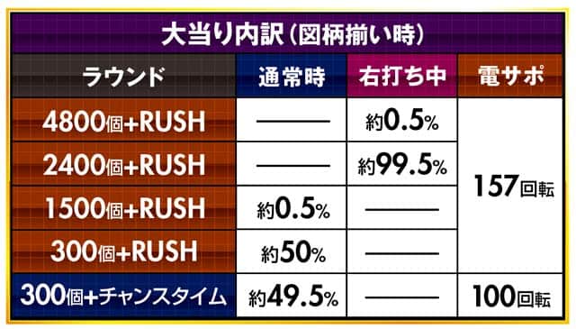 | 払い出し出玉 | 約4800個(8R×4回) 約2400個(8R×2回) 約1500個(10R) 約300個(2R) 右アタッカー10C | |
