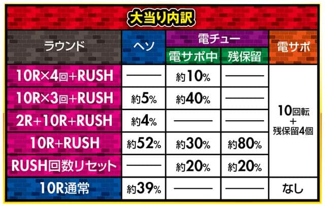 RUSHは前作同様10回転+残保留4個のショートSTで、継続率も約75%と一緒だが、最大の違いは出玉だ。前作は大当り時の約半数が3000個+αだったが、今作は半数が4500個以上!!