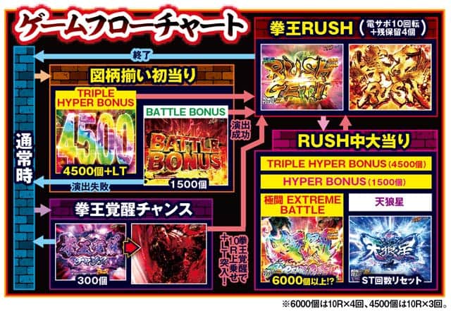 RUSHはラオウが主役の拳王RUSHと、ケンシロウによる救世主モードの2種類。さらに両モードともに「王道」「保留告知」「一発告知」の3タイプが選択可能だ。