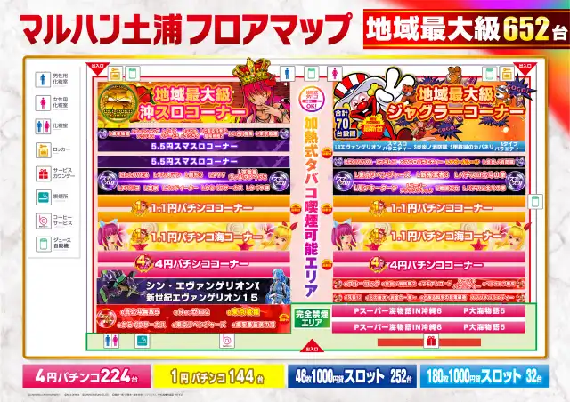 | 稼働台数 | パチンコ368台 / パチスロ284台 |