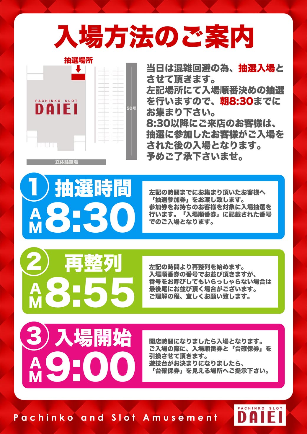| 入場ルール | お並び頂いた順番でのご入場となります。※混雑が予想される場合は抽選入場となる場合がございます。 |