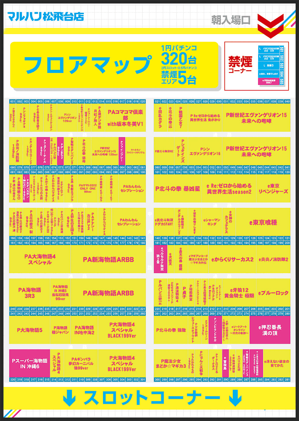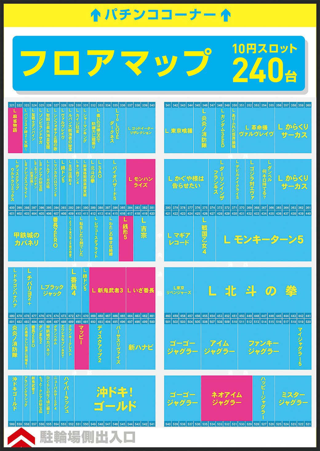 | 稼働台数 | パチンコ322台 / パチスロ243台 |