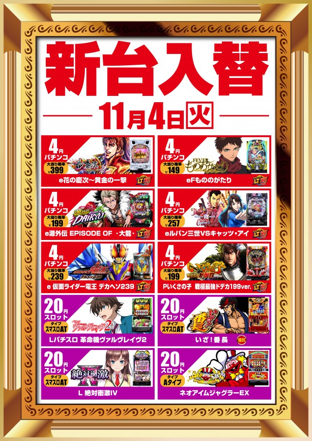 | 入場ルール | ・平日→並び順 ・土日祝日→抽選 ・新台入替→抽選 |
