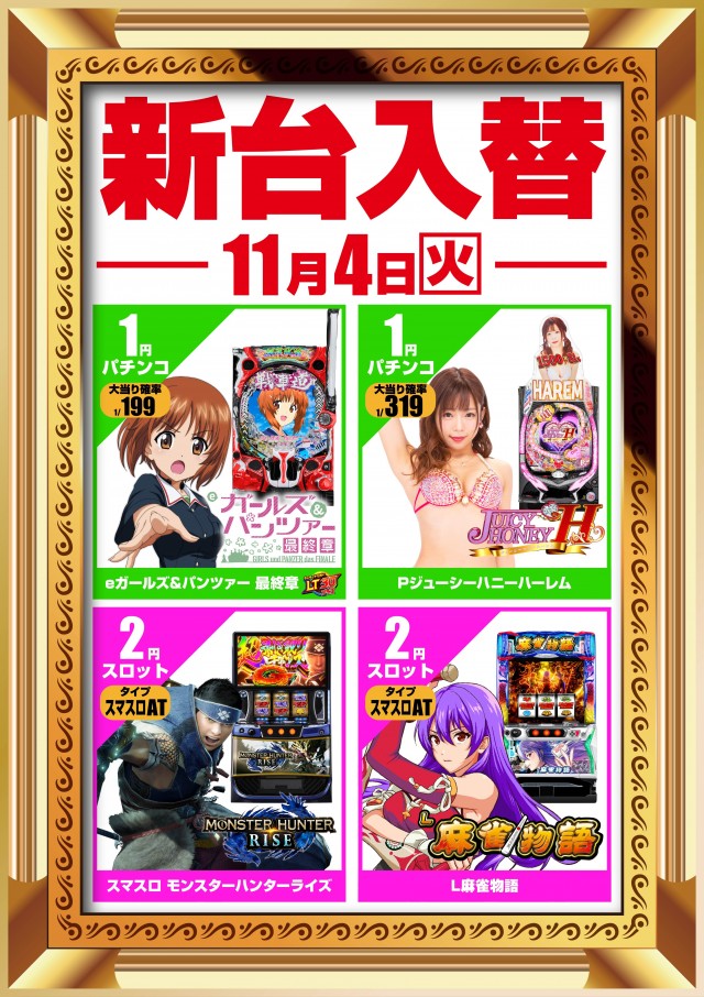 | 稼働台数 | パチンコ412台 / パチスロ232台 |