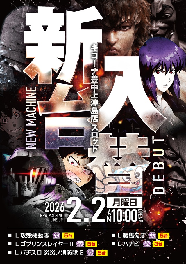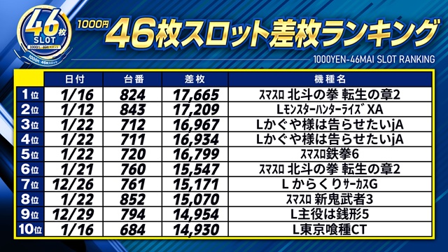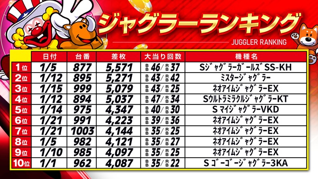 スロット設置機種は《メイン機種》→《ジャグラーシリーズ》→《バラエティ》 台数の多いもの順に表示されています。