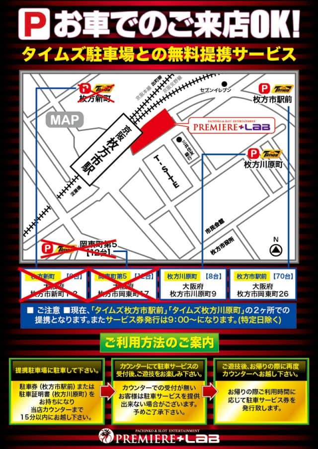 駐車場はタイムズ枚方市駅前・川原町と提携してます