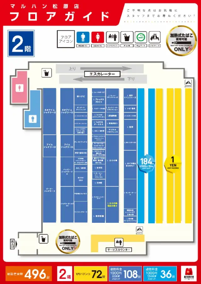 | 稼働台数 | パチンコ352台 / パチスロ144台 |