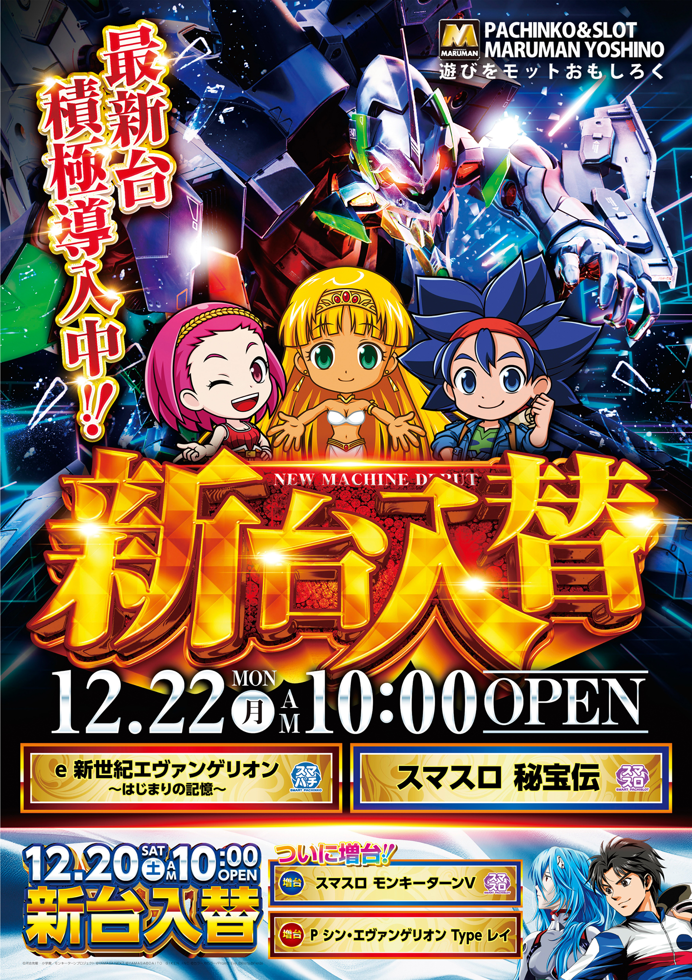 | 営業時間 | 10:00 ~ 22:40(定休日:不定休) 会員様限定で22:50まで延長遊技が出来ます。 |