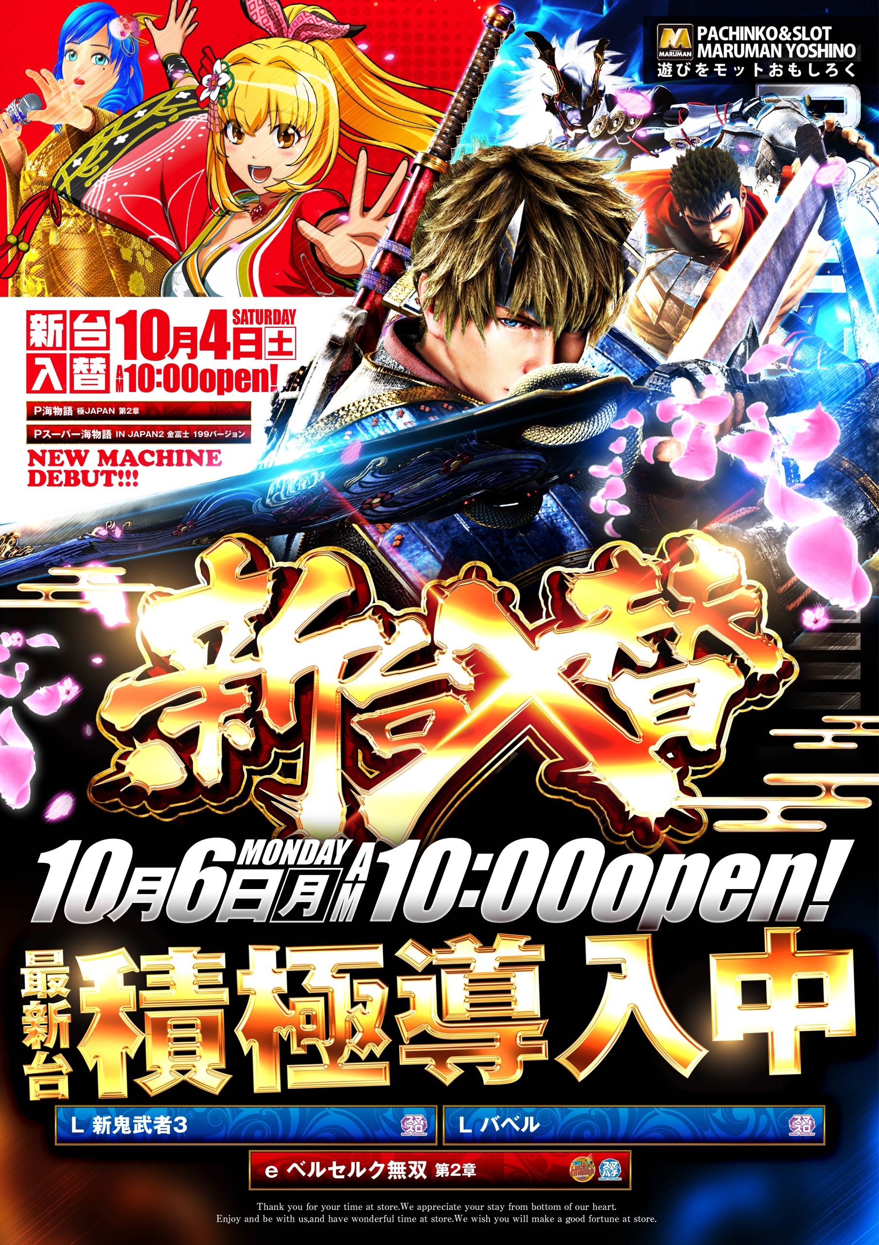 営業時間 | 10:00 ~ 22:40(定休日:不定休) 会員様限定で22:50まで延長遊技が出来ます。 |