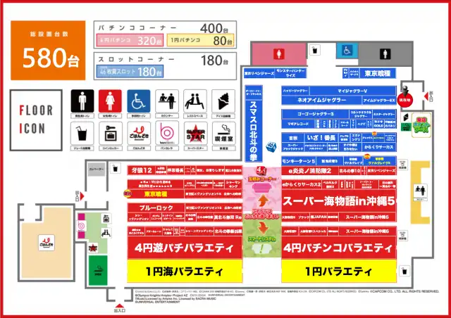 | 稼働台数 | パチンコ400台 / パチスロ180台 |