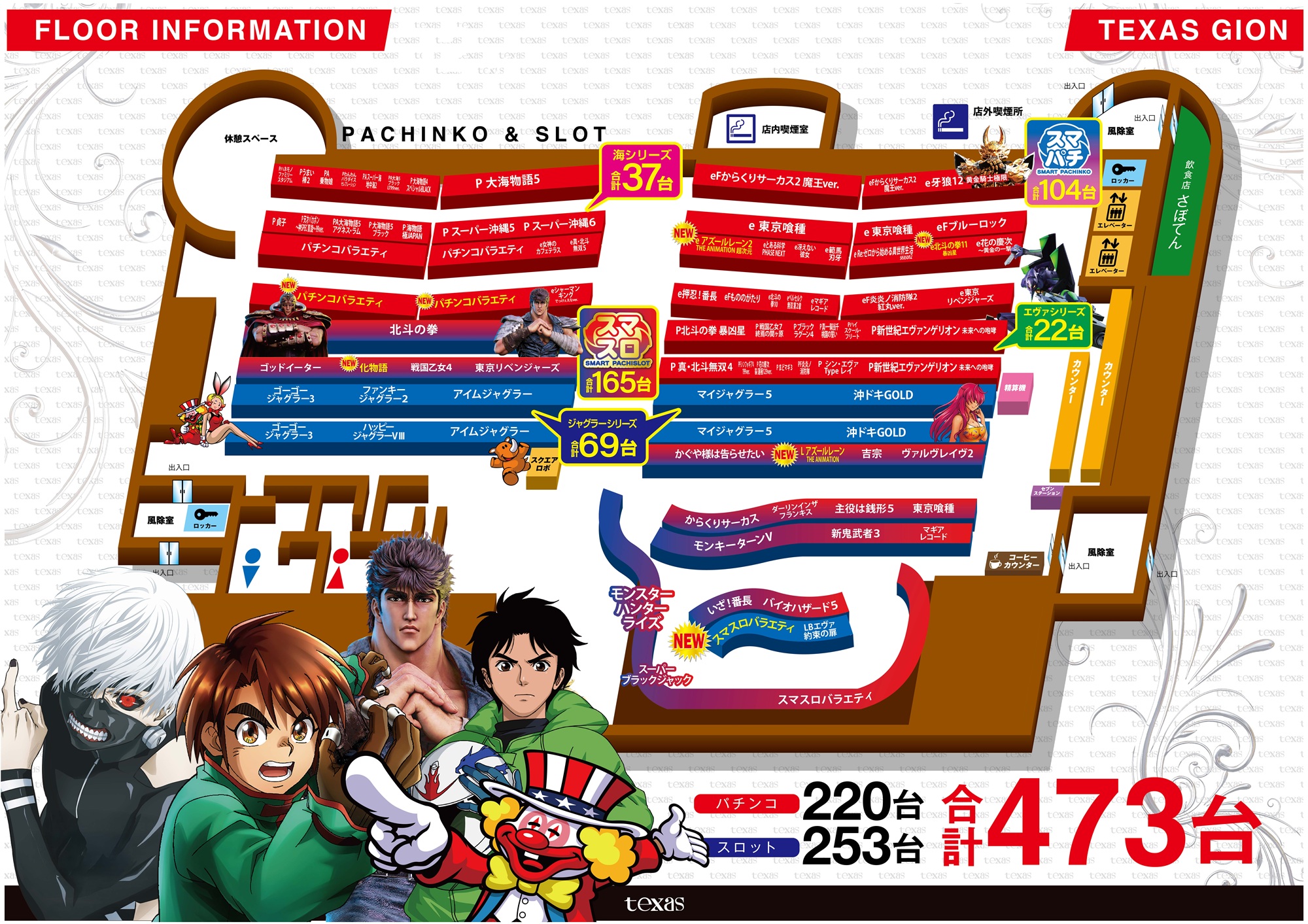 | 稼働台数 | パチンコ220台 / パチスロ253台 |