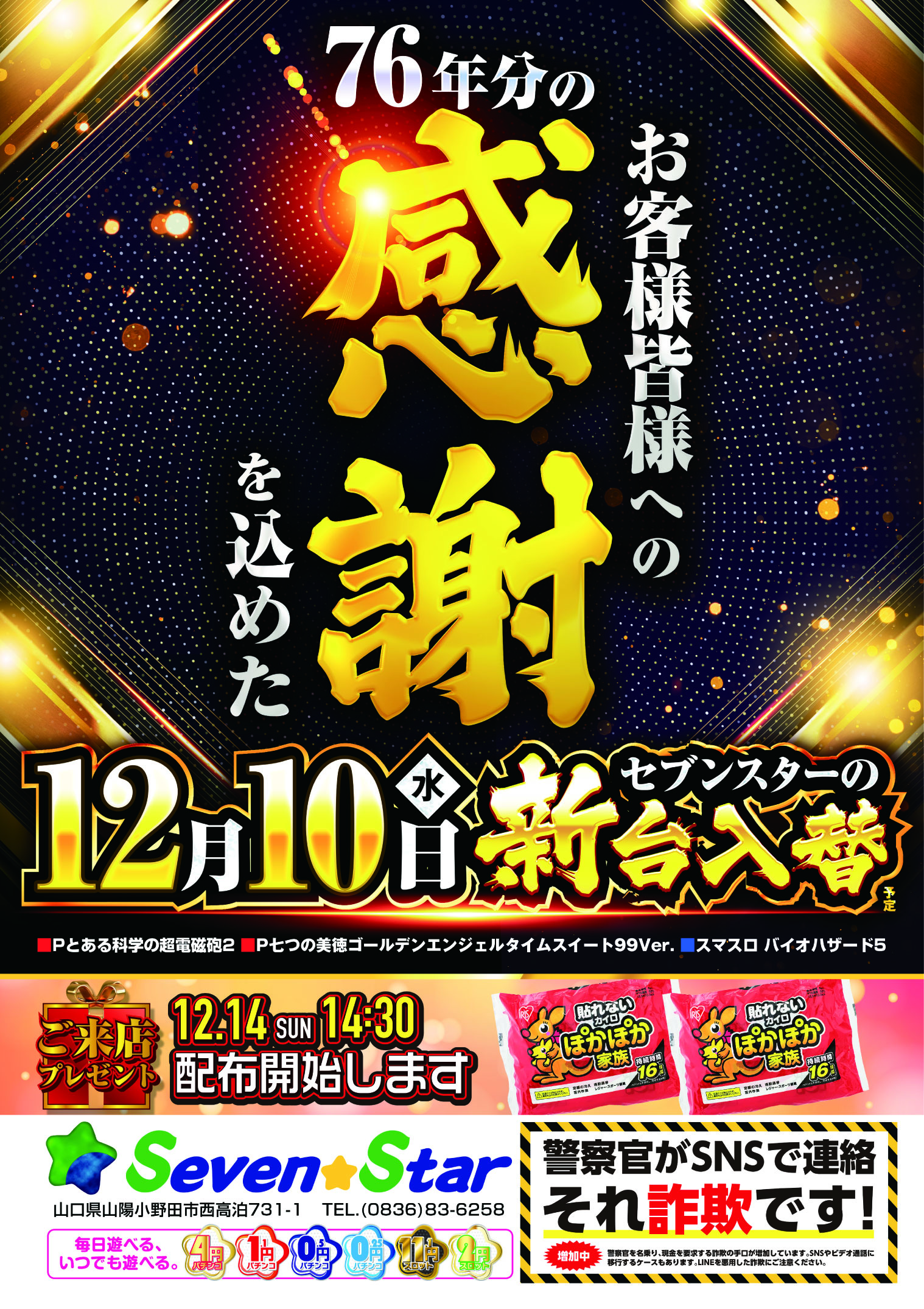 | 営業時間 | 09:00 ~ 22:50(定休日:12月10日[水]朝9時オープン!セブンスターの新台入替!!) |