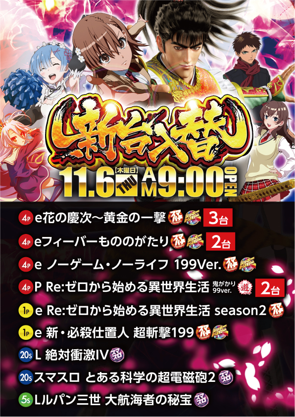 | 営業時間 | 09:00 ~ 22:45 会員カードをお持ちのお客様は、22:50まで延長遊技が可能となっております。 |