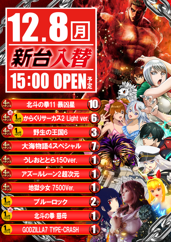 | 営業時間 | 09:00 ~ 23:30 入場抽選開始の8時30分までにご来店いただいた方は朝の入場抽選が受けられます♪ |