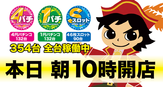 | 営業時間 | 10:00 ~ 23:00 会員カードをお持ちのお客様は、22:50迄延長遊技出来ます。 |