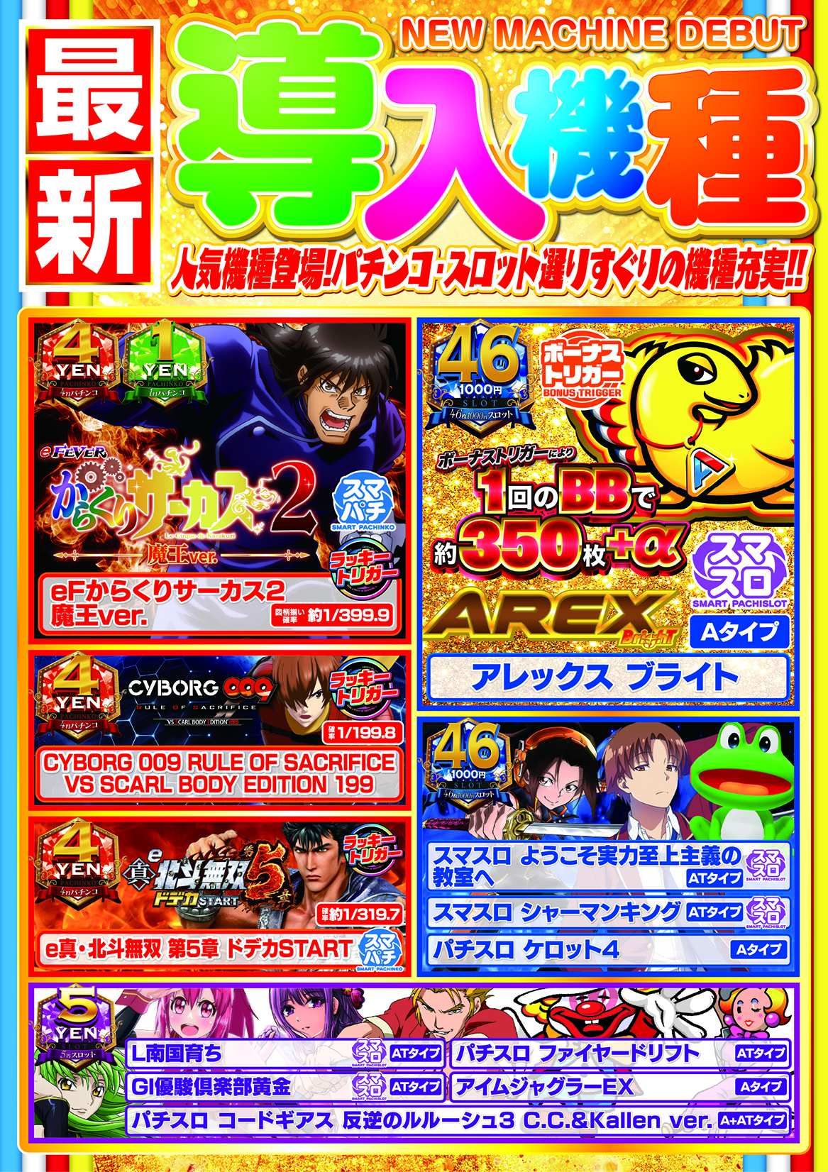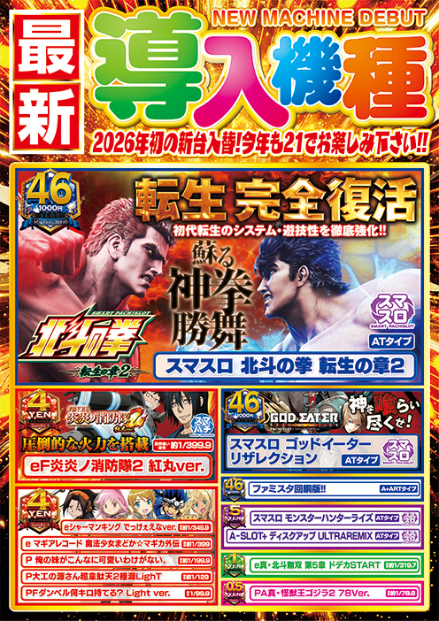 | 営業時間 | 10:00 ~ 22:50(定休日:不定休 ※新台入替OPEN前日が店休となります。) |