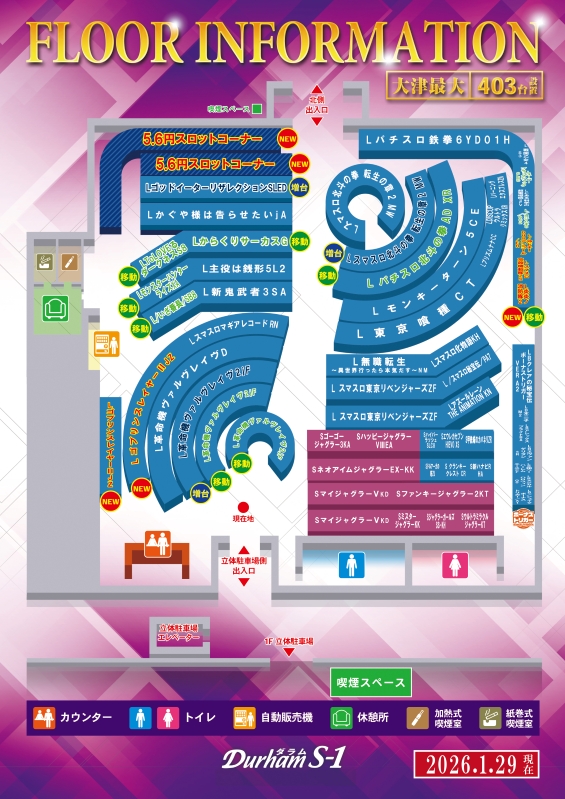 | 営業時間 | 10:00 ~ 22:50 一般遊技打ち止め 22:40 会員遊技打ち止め 22:50 |