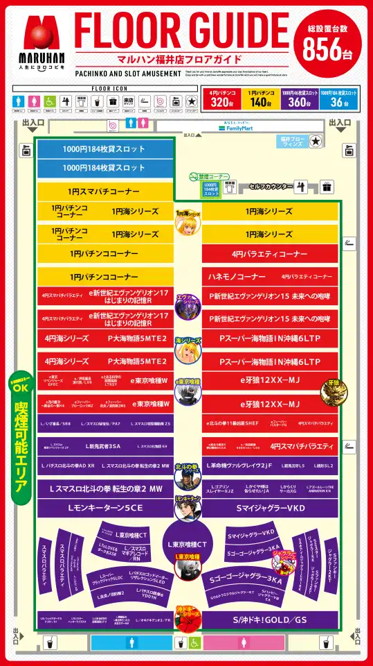 | 稼働台数 | パチンコ460台 / パチスロ396台 |