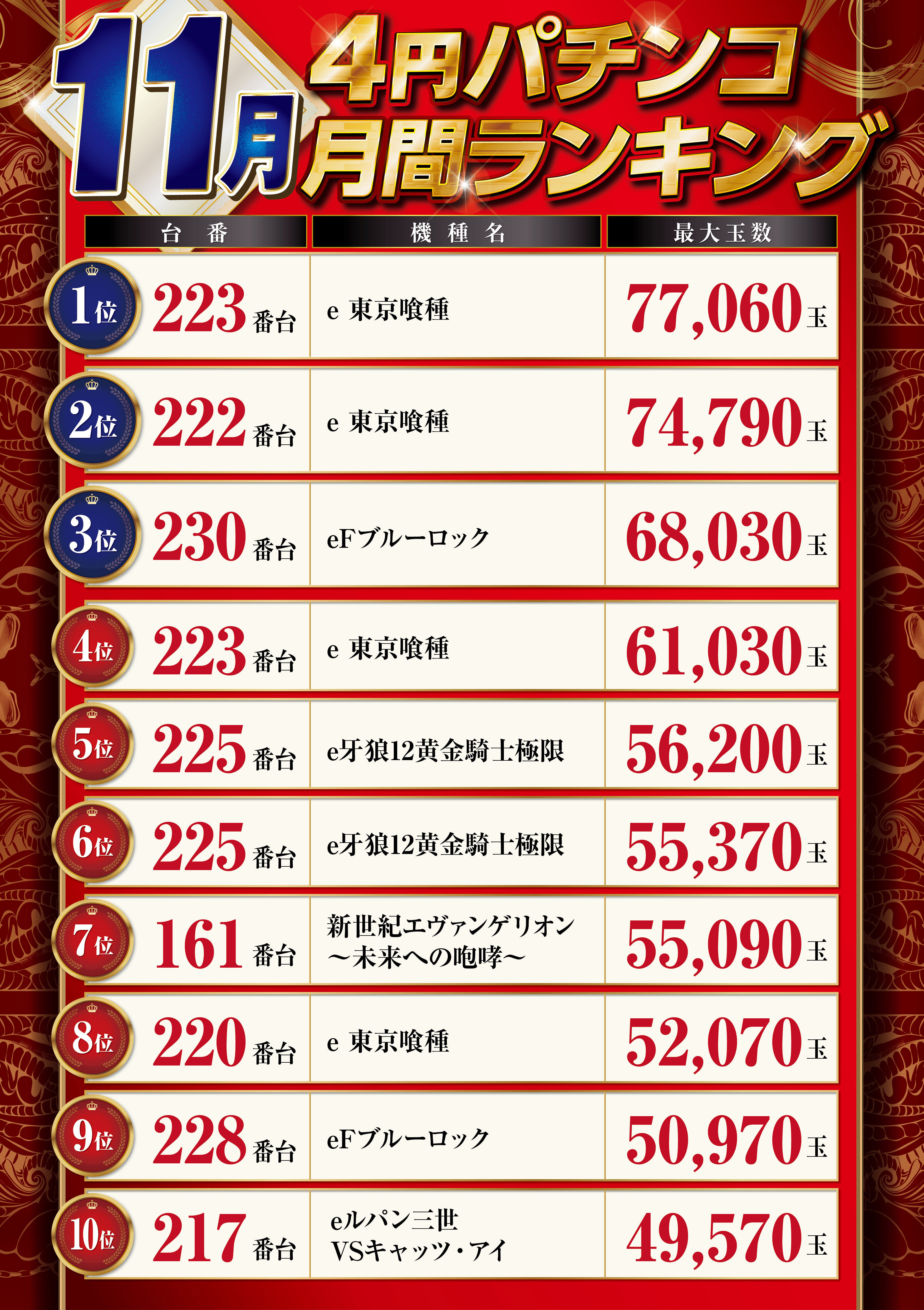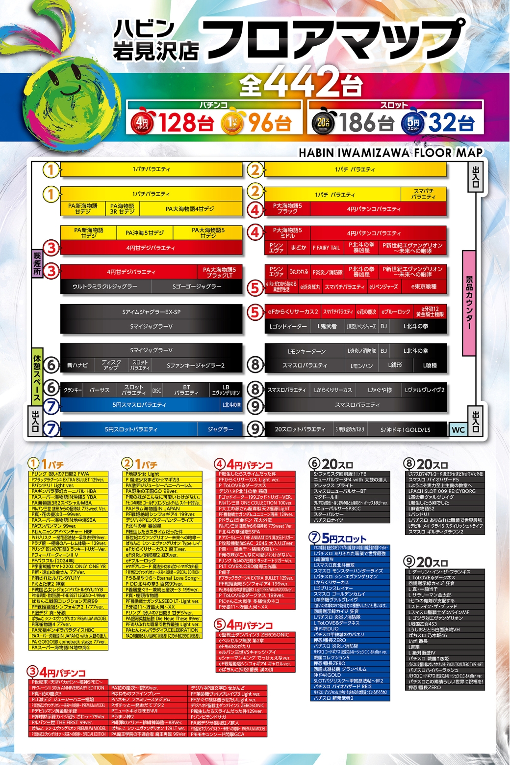 | 稼働台数 | パチンコ224台 / パチスロ218台 |