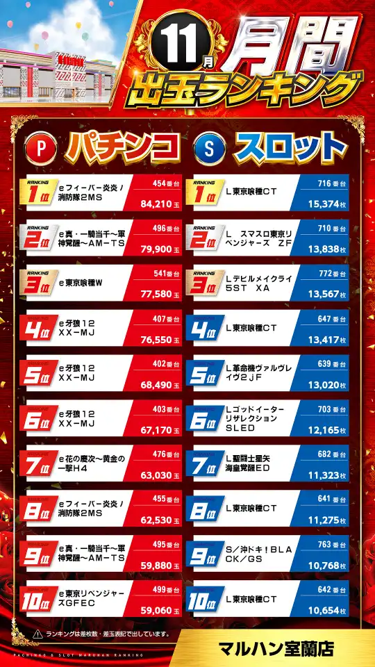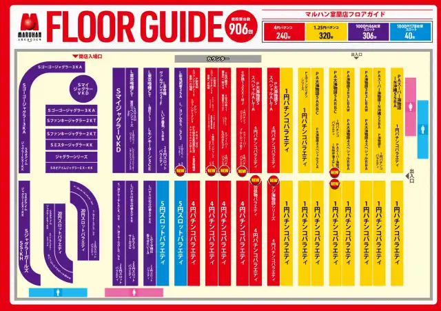 | 稼働台数 | パチンコ560台 / パチスロ346台 |