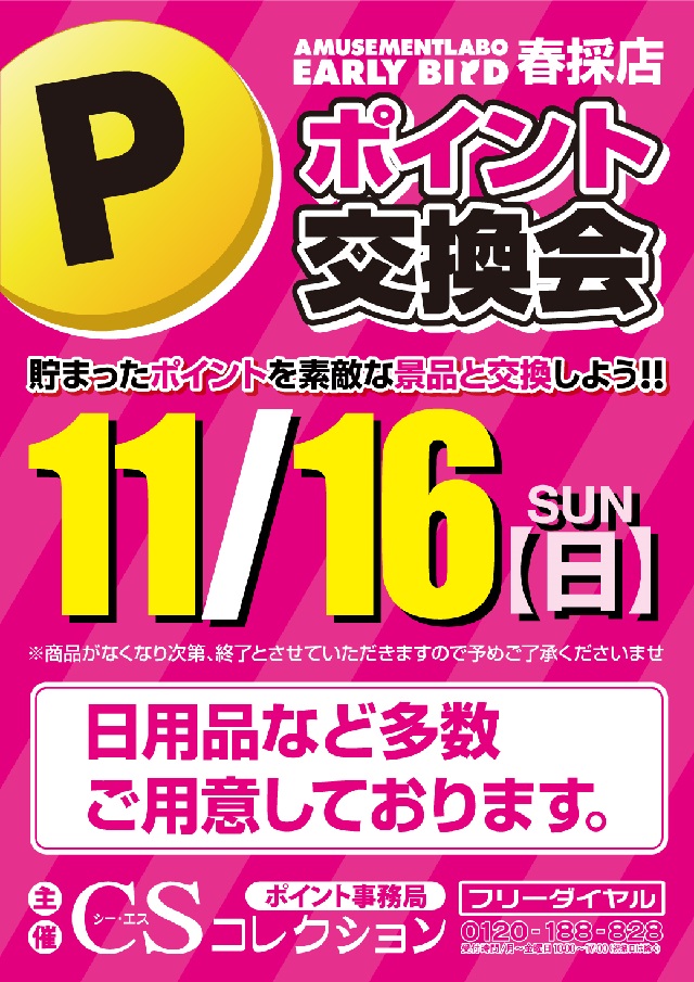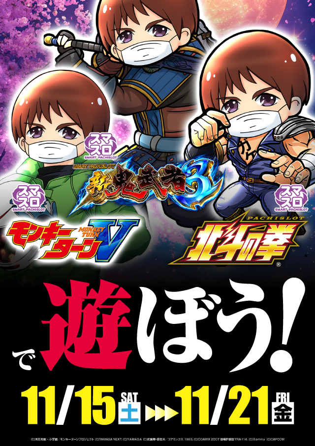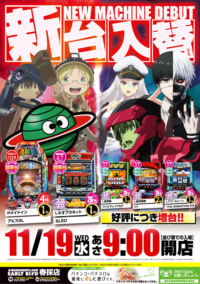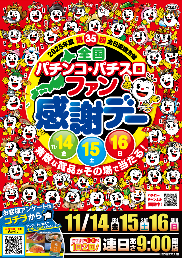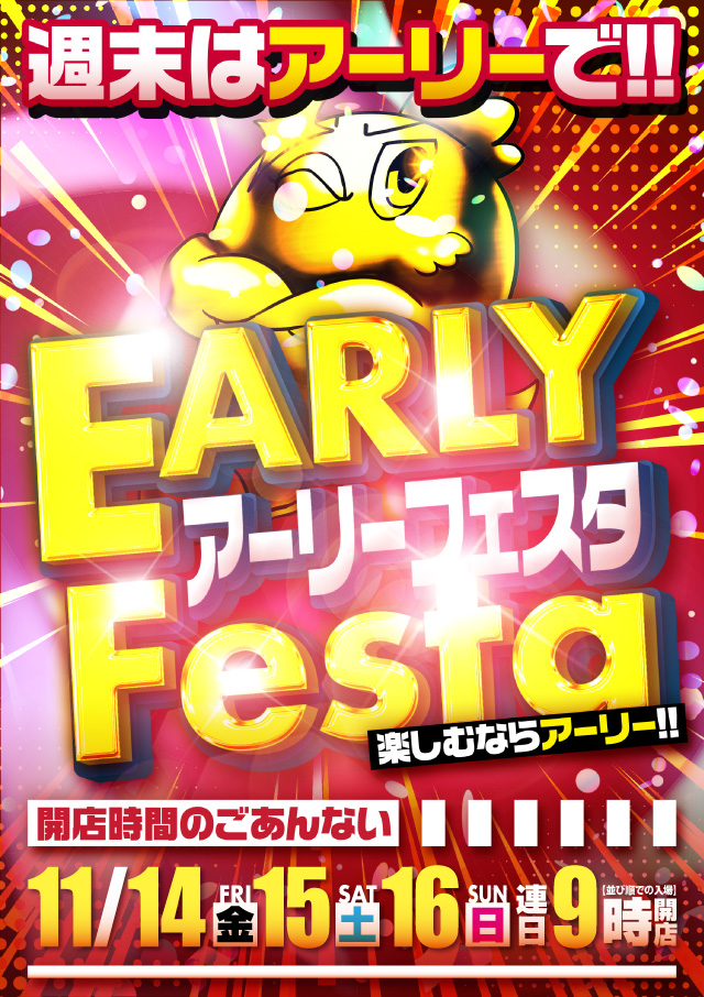 | 営業時間 | 09:00 ~ 23:00(定休日:年中無休) お客様遊技終了時間は22:45になります。 |